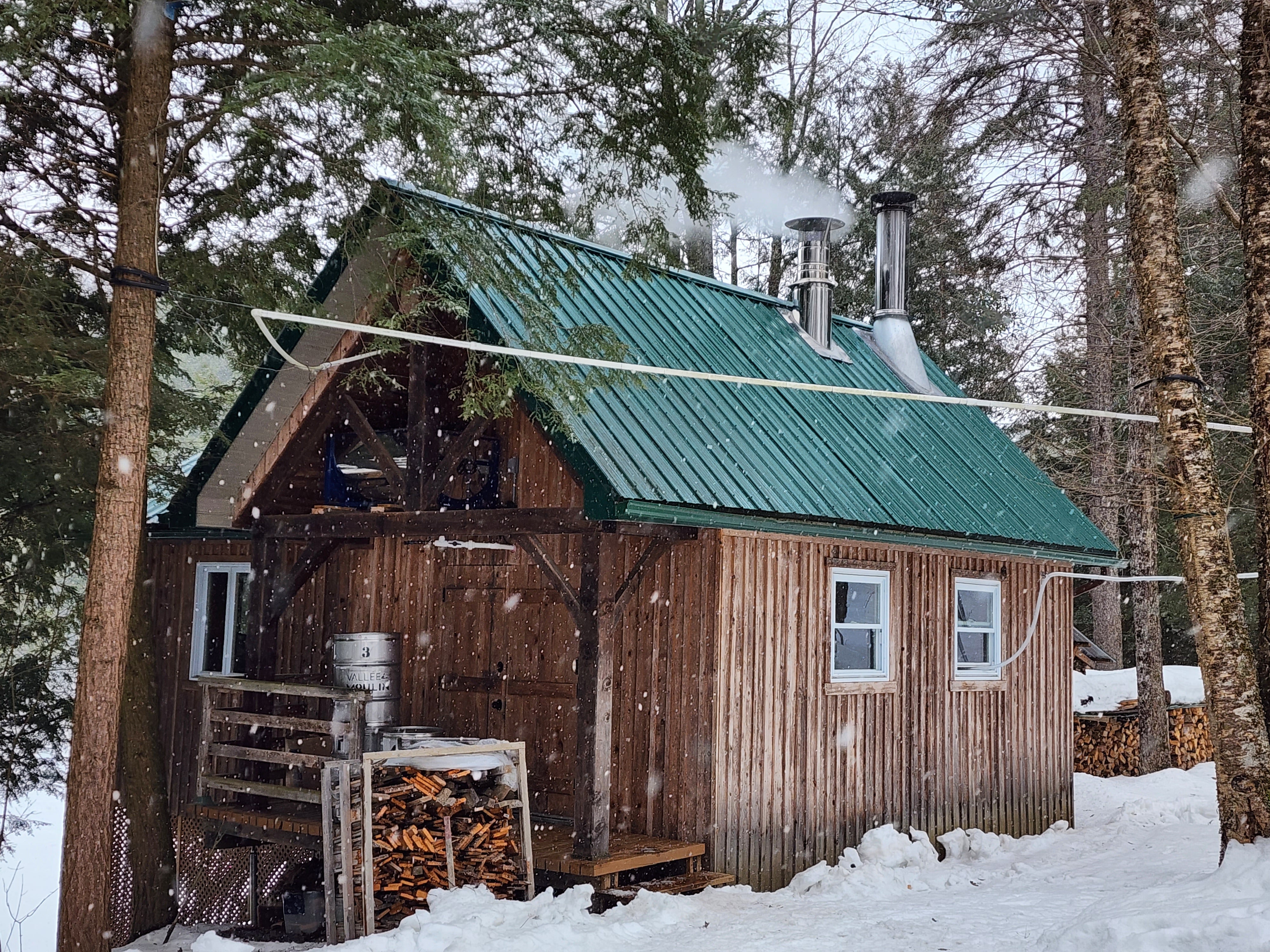 Notre cabane à sucre est située dans la vallée à une centaine de mètres du moulin, en amont de la rivière au Saumon. Construite sur pieux au bord de l’eau, elle abrite nos équipements d’érablière tous récents et sélectionnés en termes d’efficacité et de durabilité. Deux stations de pompage sont installées dans la vallée afin d’acheminer l’eau d’érable de chacune des près de 1200 entailles via la tubulure au système d’osmose inversée afin de séparer l’eau sucrée d’une partie de son eau. L’eau d’érable est ensuite envoyée vers l’évaporateur pour bouillir le sirop.
